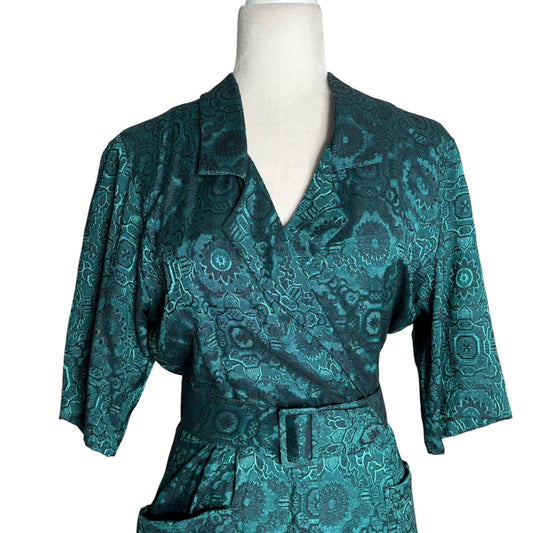 Vintage 90s All That Jazz Satin Wrap Dress XSmall Teal Black Belted Pockets