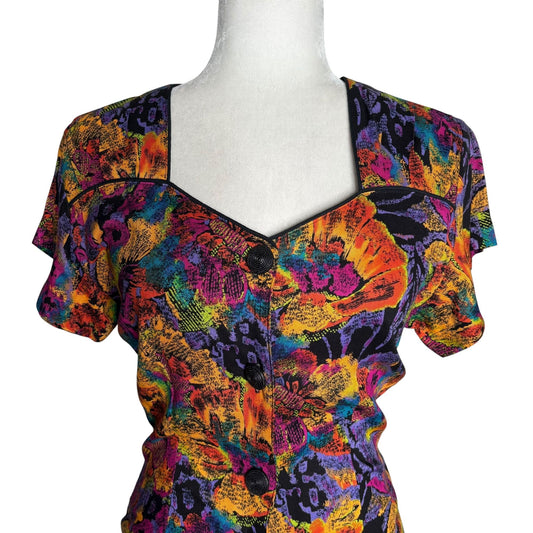 Vintage 80s Floral Button Front Sheath Dress Multicolor Medium Short Sleeve