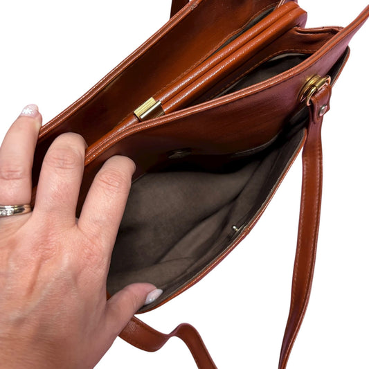 Vintage 80s Brown Faux Leather Shoulder Bag Interior Pockets Kiss Lock Magnetic