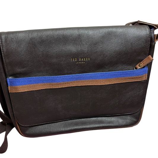 Ted Baker London Messenger Bag Brown Faux Leather Crossbody Blue Stripe Zipper