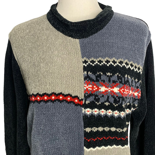 Vintage 90s Chenille Knit Pullover Sweater M Black Color Block Rolled Collar