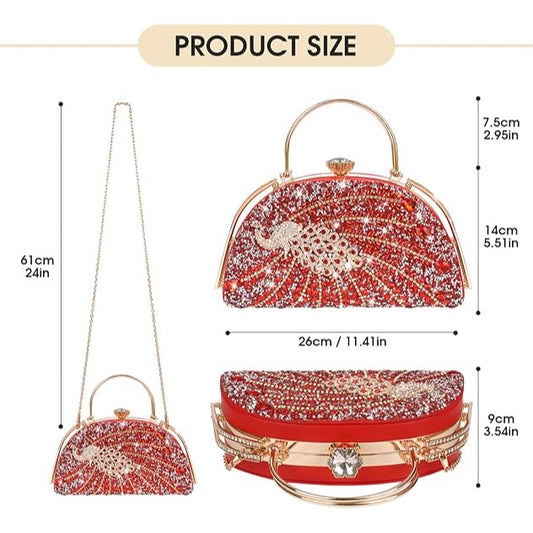 Peacock Rhinestone Evening Purse Handbag Red Shoulder Chain Holiday Party NEW