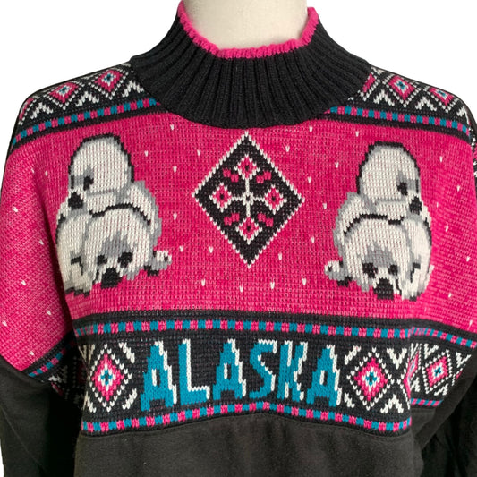 Vintage 90s Mock Neck Alaska Sweatshirt L Black Knit Seals Pullover Fleece USA