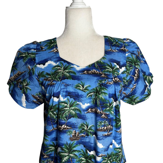 CT Hawaii Fashions Hawaiian Tropical Maxi Dress Size M Blue Short Sleeve Cotton
