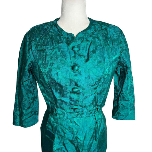 Vintage 50s Floral Brocade Dress Jacket Set Size Small Green Short Sleeve Zipper