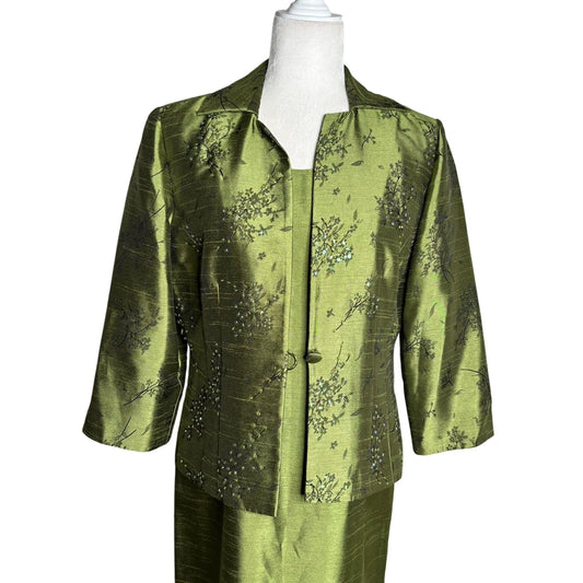 Coldwater Creek Two Piece Green Brocade Dress Jacket Set Petite 10 Green Beaded