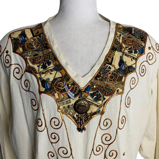 Vintage 90s Hand Painted T Shirt Dress M Cream Crochet Knit Fringe Pockets