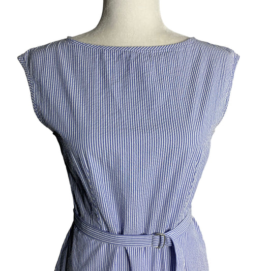 Uniqlo Sleeveless Belted Swing Dress S Blue White Striped Pockets Back Zip