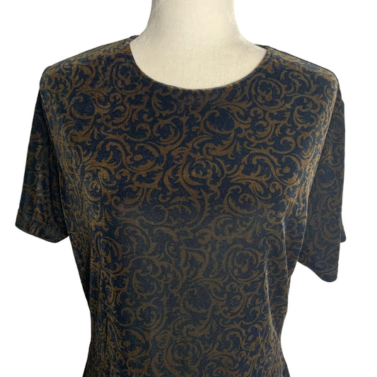 Vintage 90s Velvet Sheath Dress M Black Brown Swirls Short Sleeve Stretch Goth