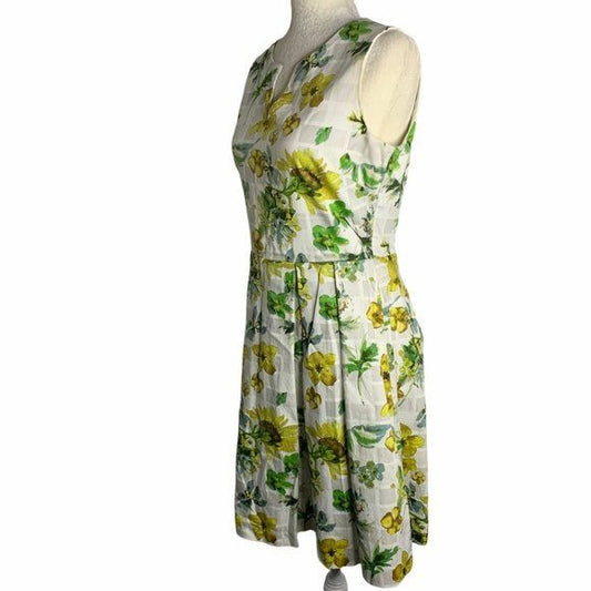 Julian Taylor Pleated Sleeveless Dress 8 White Floral Split V Zip Lined Pockets