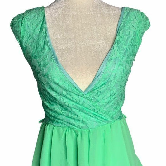 Enlin Deep V Lace Chiffon Mini Dress S Green Cap Sleeve Lined Zip NEW