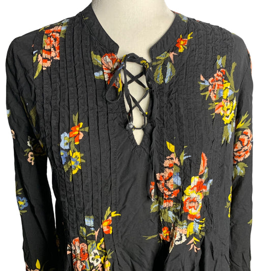 Old Navy Long Sleeve Dress M Black Floral Lace Up Pin Tucks Unlined