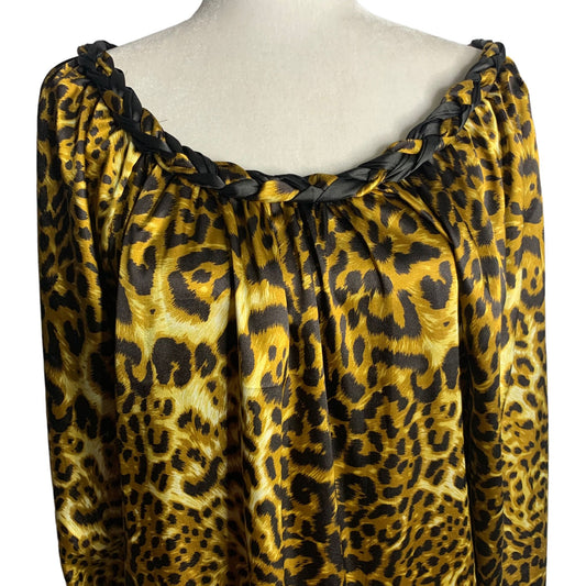 Vintage 90s Leopard Print Shift Dress L Brown Braided Collar Puff Sleeve Pockets