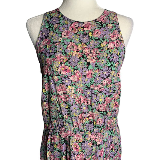 Vintage 90s Sleeveless Cottagecore Dress M Black Floral Pockets Elastic Waist