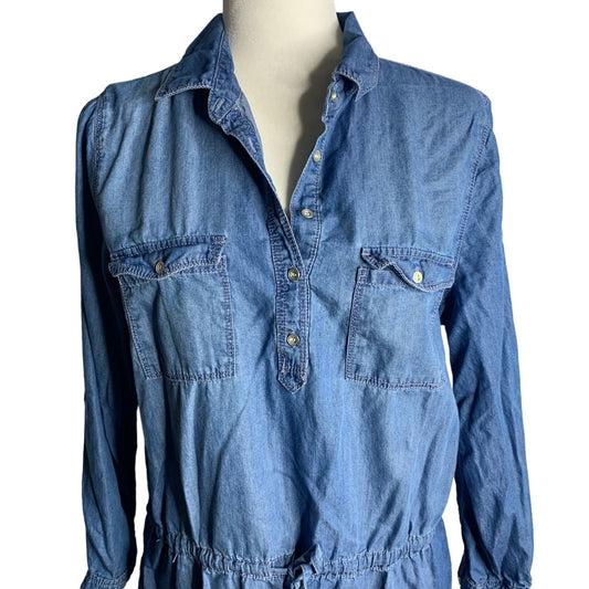 Gloria Vanderbilt Denim Chambray Dress M Blue Buttons Pockets Roll Tab Sleeves