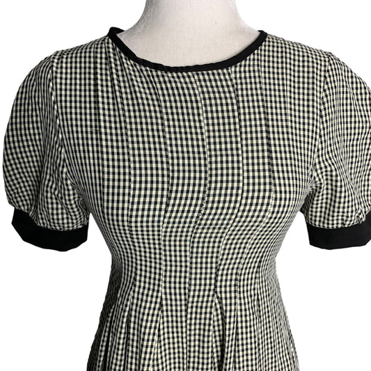 Retro Pleated Midi Swing Dress S Black White Gingham Check Short Sleeve Zipper