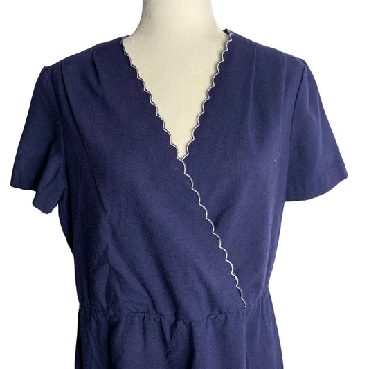Vintage 80s Midi Sheath Dress M Blue Surplice Neck Elastic Waist Short Sleeves