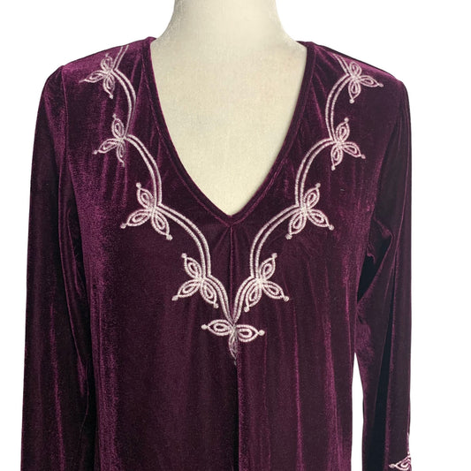 RusttyDustty Velvet Shift Dress M Purple V Neck Embroidered Long Sleeves