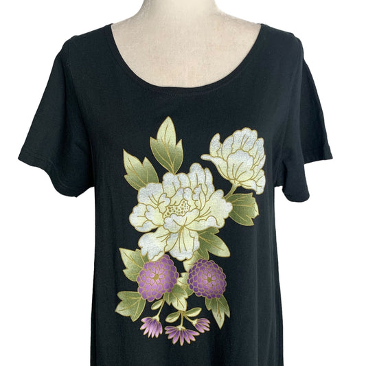 Vintage 90s Hawaiian Maxi T Shirt Dress M Black Floral Painted Short Sleeves