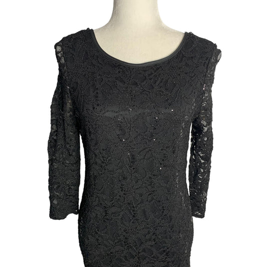 RSVP Sequin Lace Sheath Dress 10 Black Lined Round Neck Pullover Sheer Sleeves