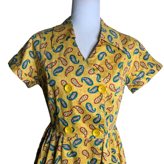Bettie Page Las Vegas Retro Swing Dress M Yellow Paisley Pinup Buttons Pockets