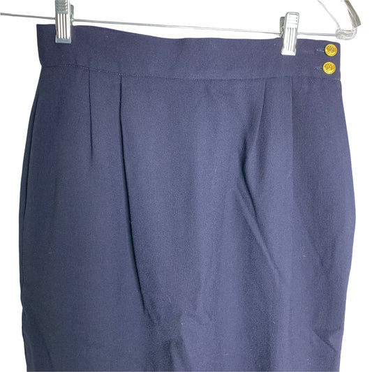 Vintage 80s Wool Pencil Skirt S Navy Blue Lined Pockets Pleat Front Buttons