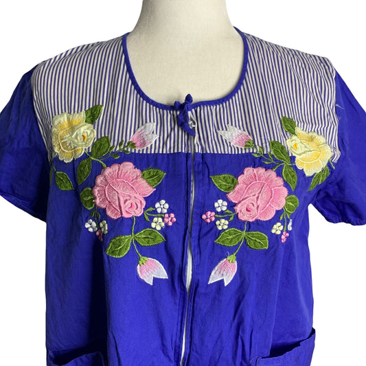 Vintage Embroidered Shift Dress M Blue Floral Pockets Zip Front Short Sleeves