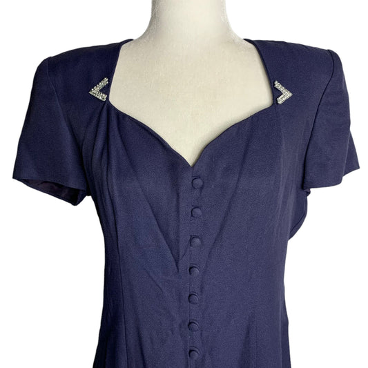 Vintage 80s Wiggle Sheath Dress M Blue Buttons Zip Sweetheart Short Sleeves