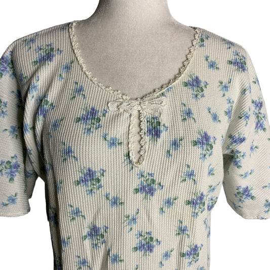 Circa 2000 Waffle Knit Nightgown Sleep Shirt M White Floral Short Sleeve Cotton