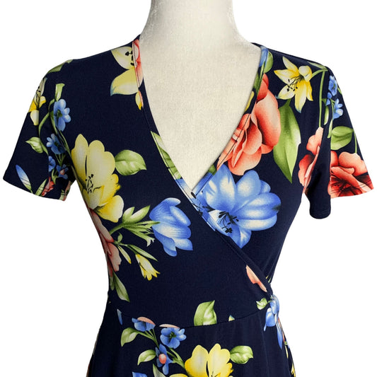 Bonded Faux Wrap Mini Dress S Blue Floral Short Sleeves V Neck Surplice