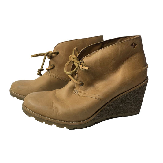 Sperry Harlow Burnished Leather Wedge Boots 8M Brown Tie Front Booties Pumps