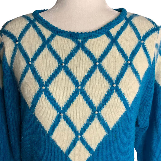Vintage Miller Wool Angora Blend Sweater L Blue Knit Beaded Pullover Ribbed Trim