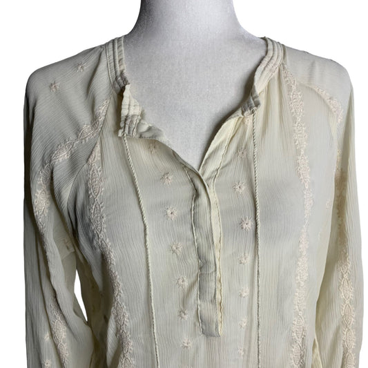Democracy Embroidered Peasant Top S Beige Long Sleeve V Neck Snap Slightly Sheer