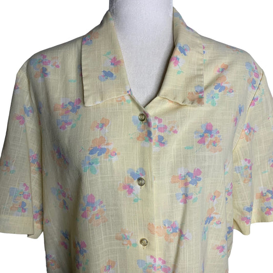 Vintage Russ Togs Button Up Collared Shirt M Yellow Floral Short Sleeve Cotton