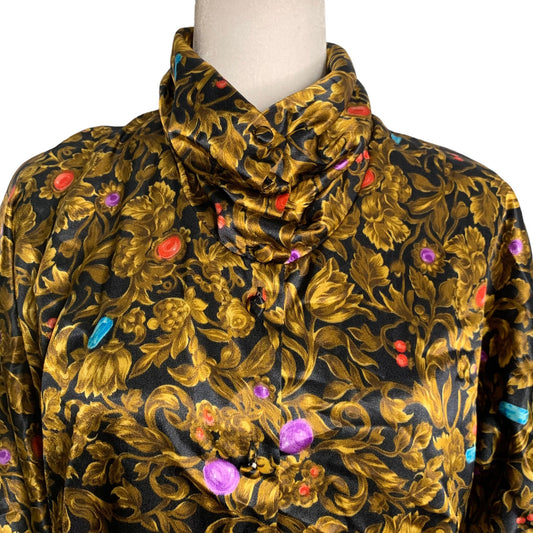 Vintage 80s Baroque Button Up Shirt M Black Gold Silky High Neck Long Sleeves