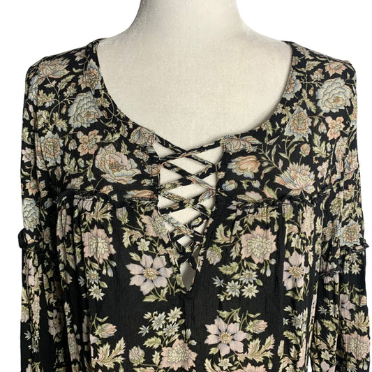 American Eagle Boho Tunic Top S Black Floral Bell Sleeves Criss Cross V Neck