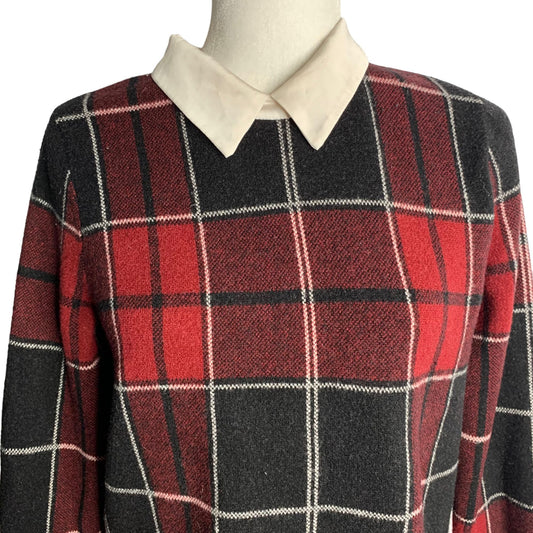 Tahari Layered Look Flannel Sweater M Red Plaid Long Sleeve Collar Keyhole Back