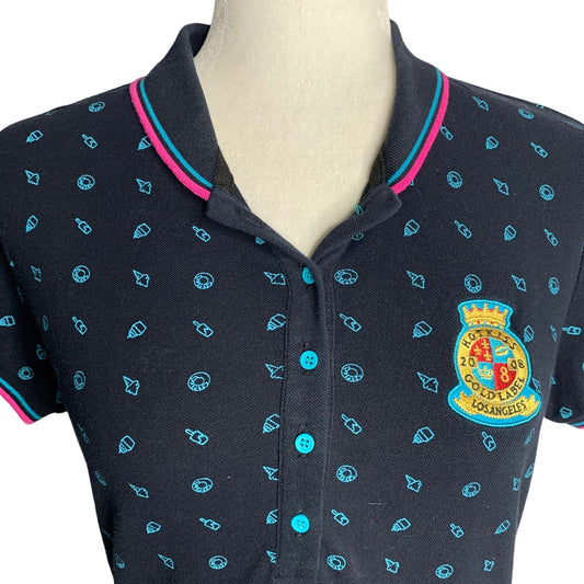 Hot Kiss Short Sleeve Polo Shirt S Black Blue Embroidered Buttons Collared