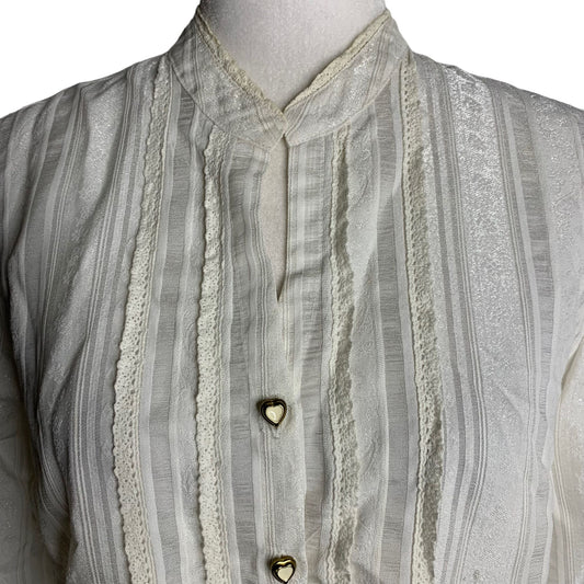Vintage Button Up Jacquard Blouse L White Heart Buttons V Neck Lace Long Sleeves