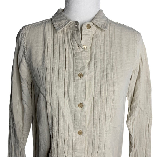 Button Up Pin Tuck Pleated Tunic Shirt S Beige Long Sleeves Collared Lined