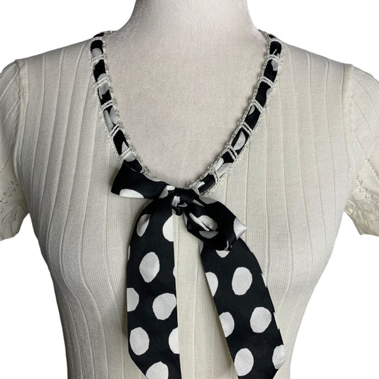 Beaded Short Sleeve Knit Top S Cream Scarf Bow Ribbed Polka Dots