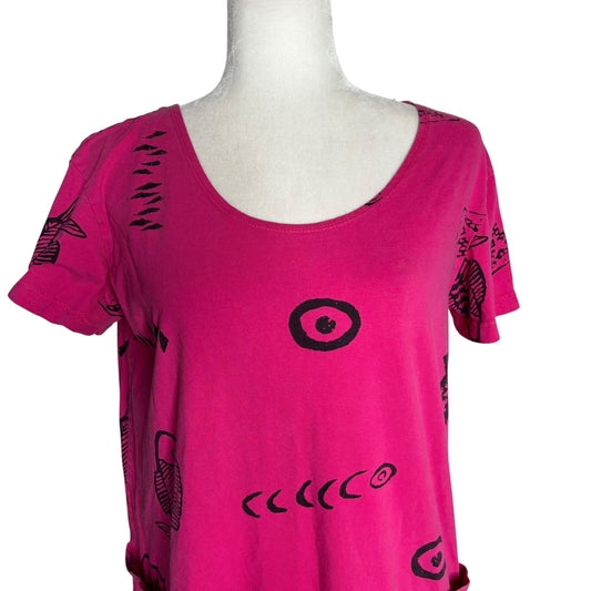 Vintage 90s Graphic Fish Print Shift Dress Small Pink Short Sleeves Pockets