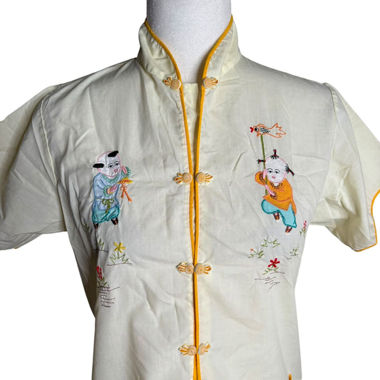 Vintage 70s Embroidered Chinese Short Sleeve Top Small Yellow Snaps Pockets