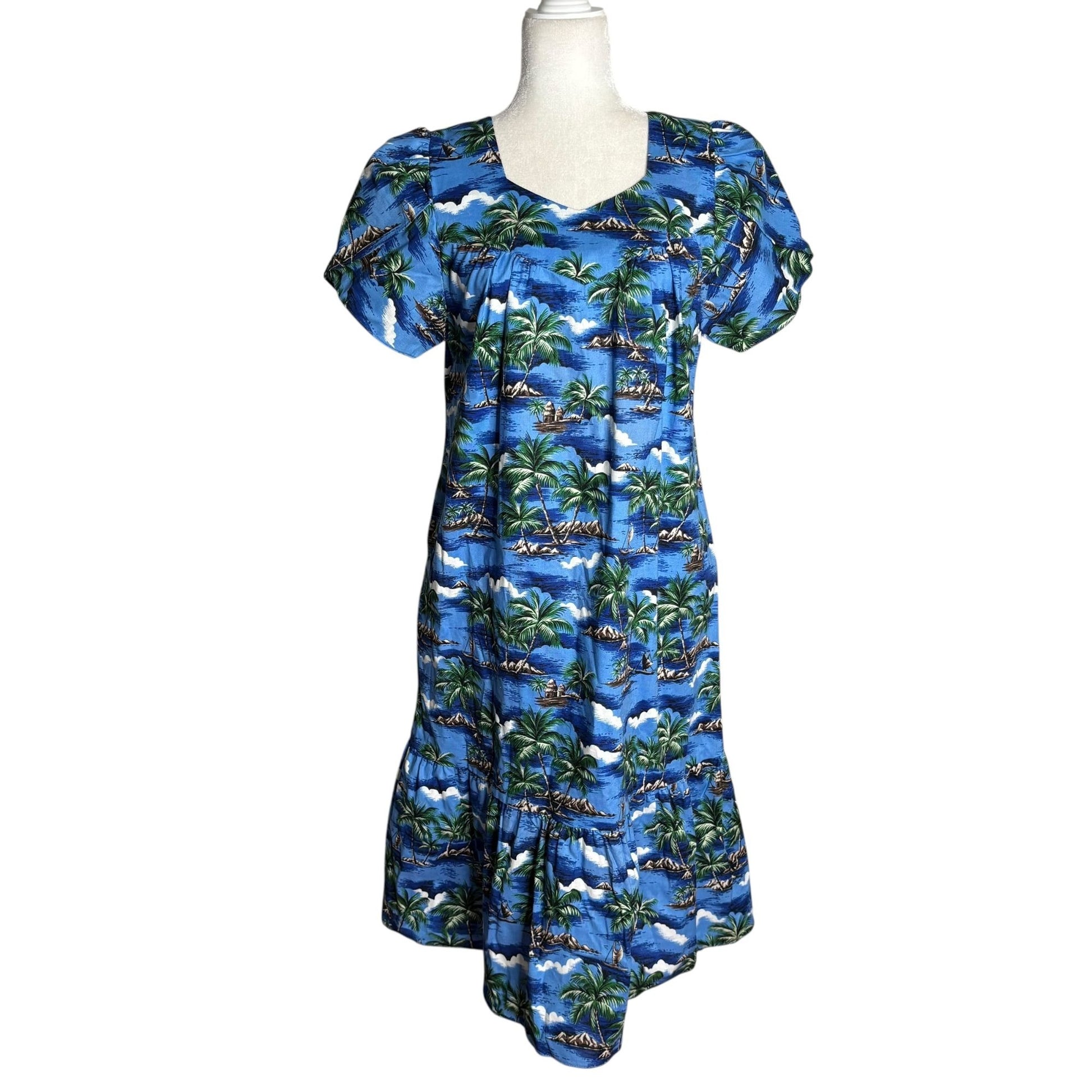 CT Hawaii Fashions Hawaiian Tropical Maxi Dress Size M Blue Short Sleeve Cotton