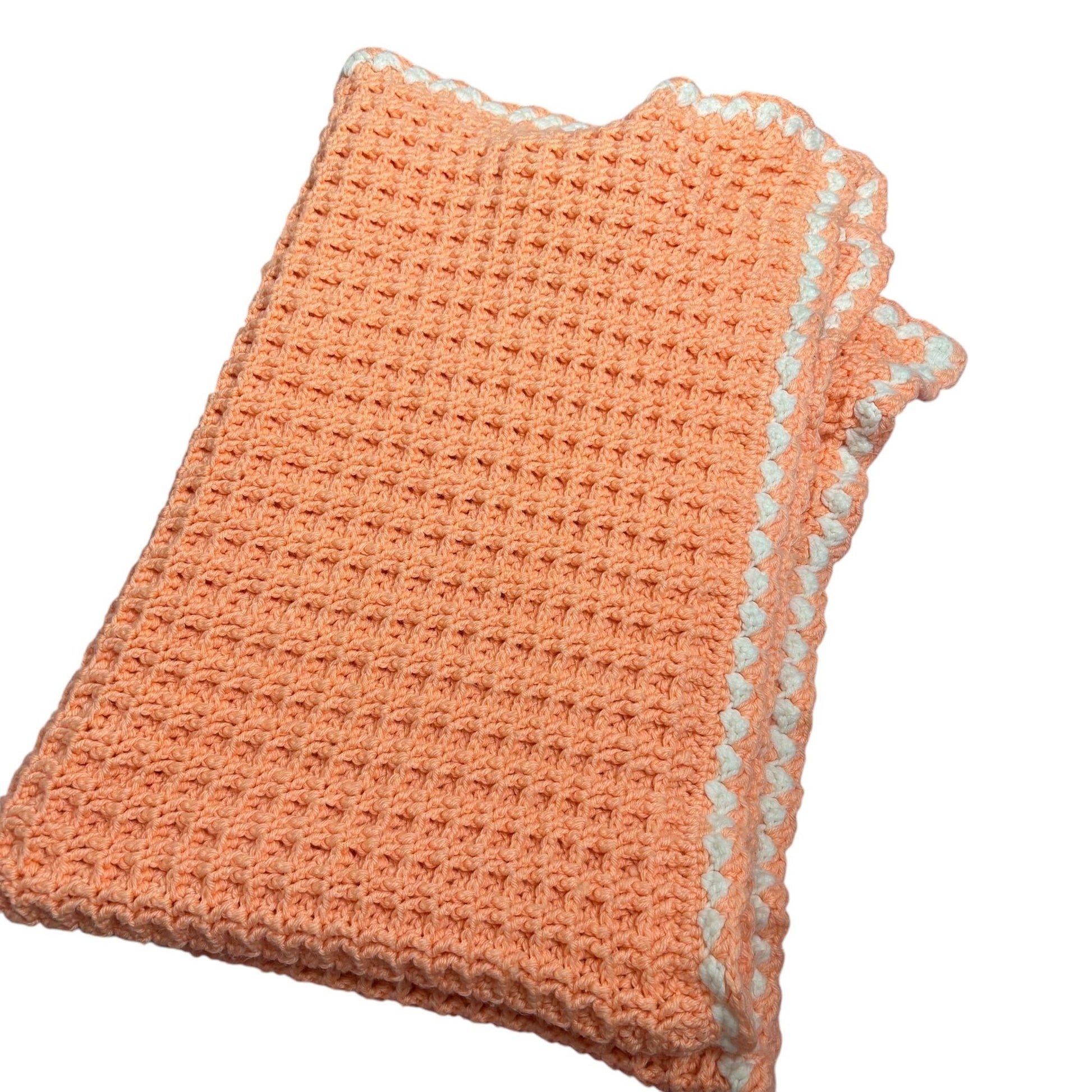 Handmade Peach Crochet Baby Blanket Throw 50 x 34 White Trim