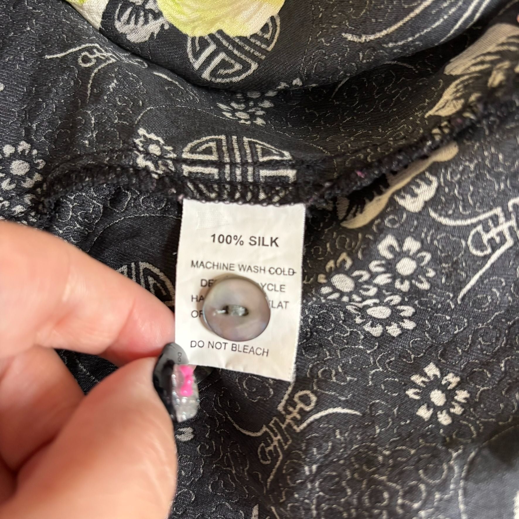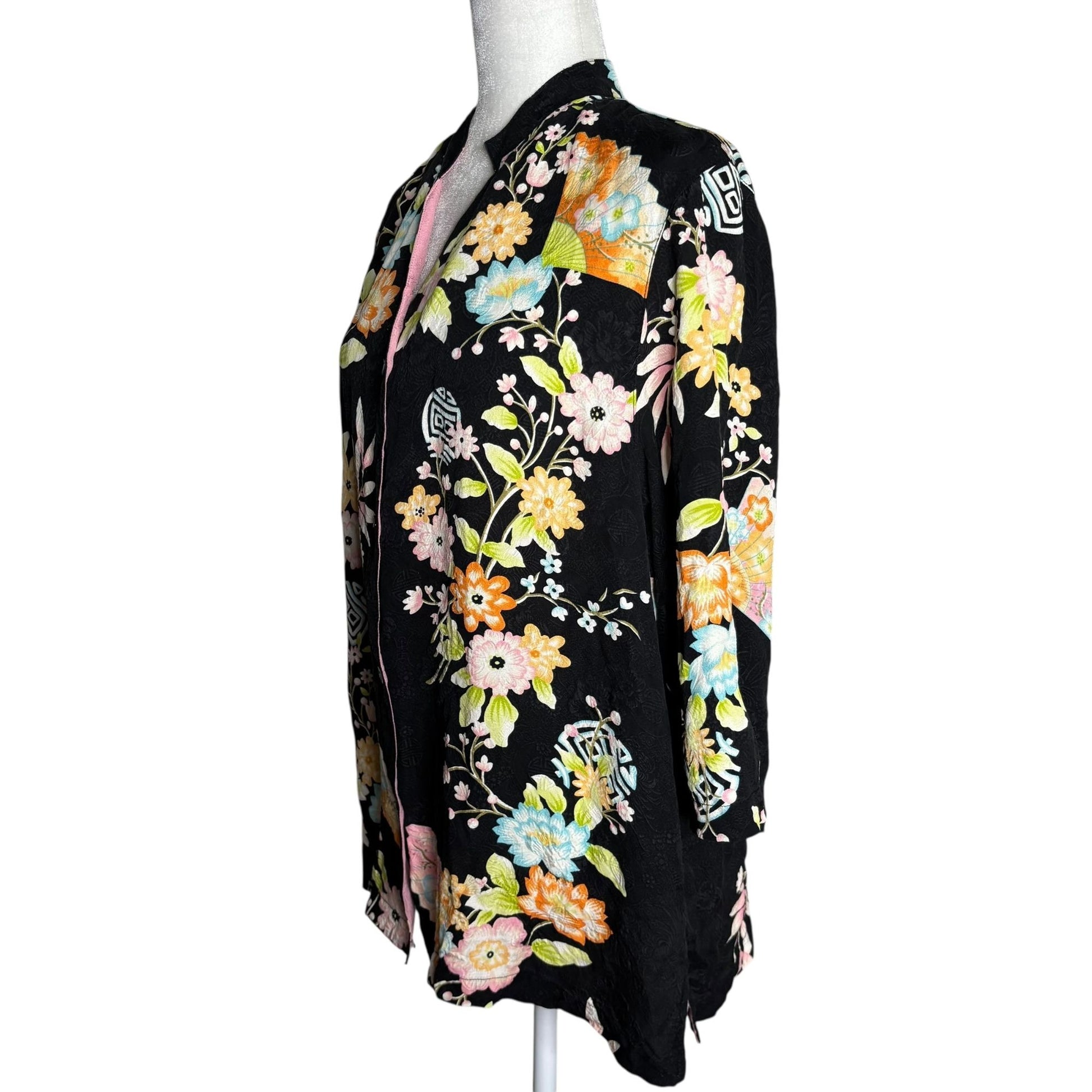 Silk Button Down Kimono Style Blouse Large Black Floral Mandarin Collar