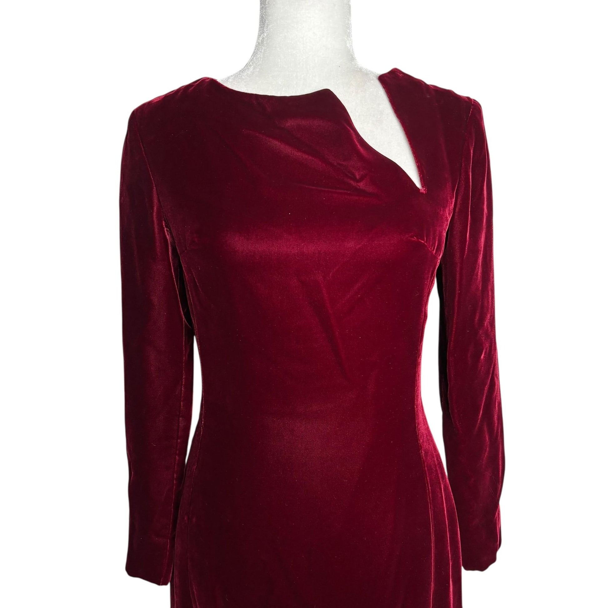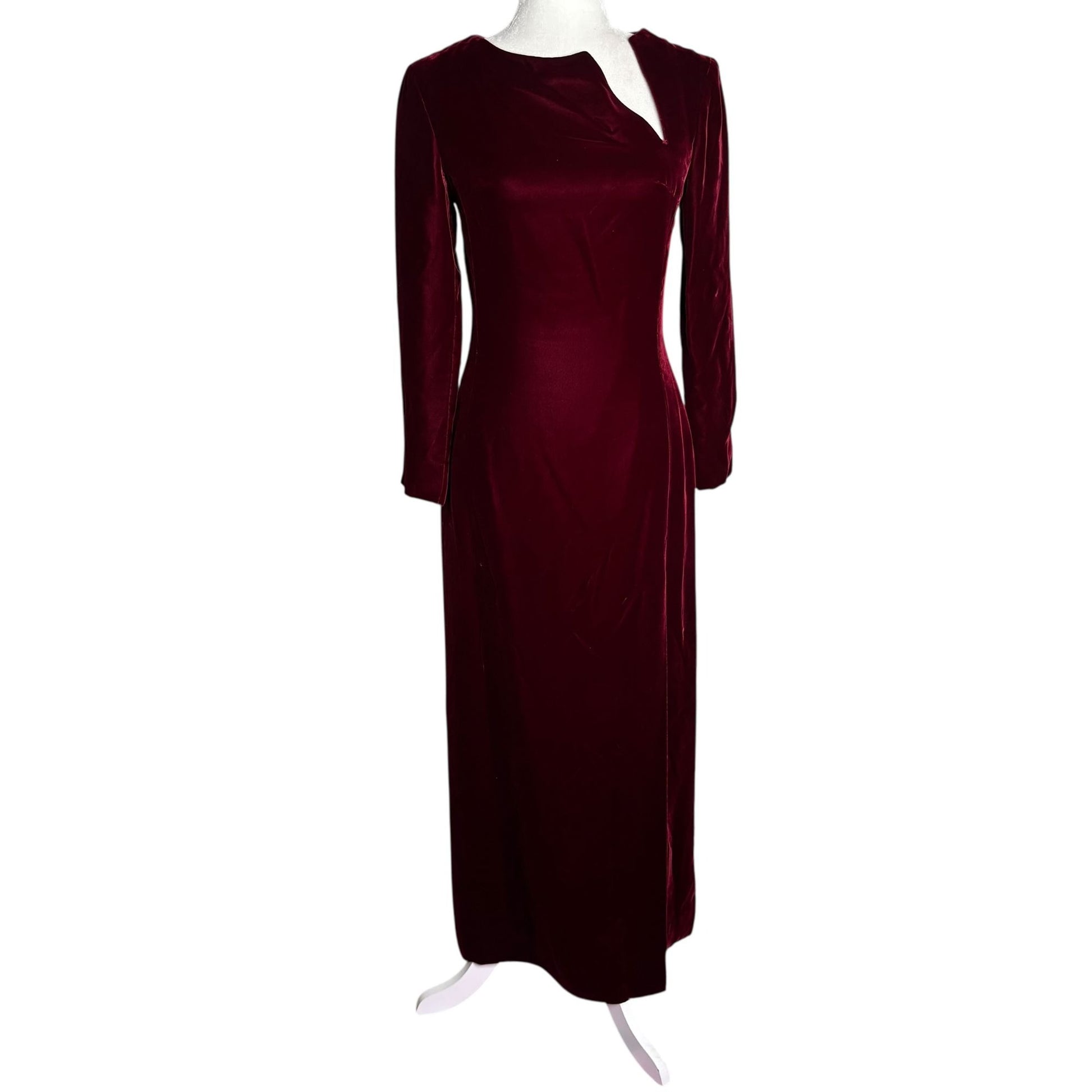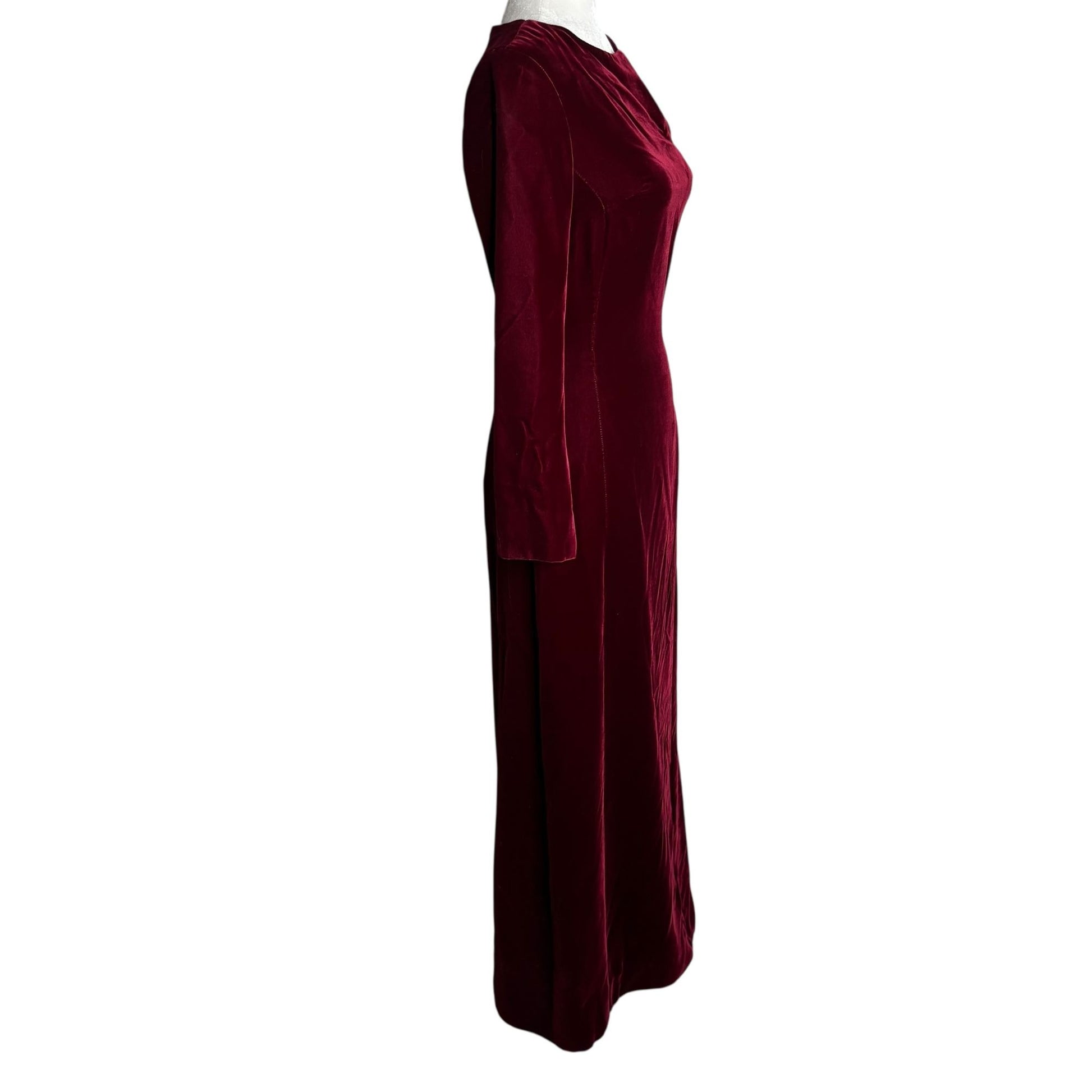 Vintage 50s Velvet Long Sleeve Maxi Dress Small Burgundy Red Lined Metal Zipper