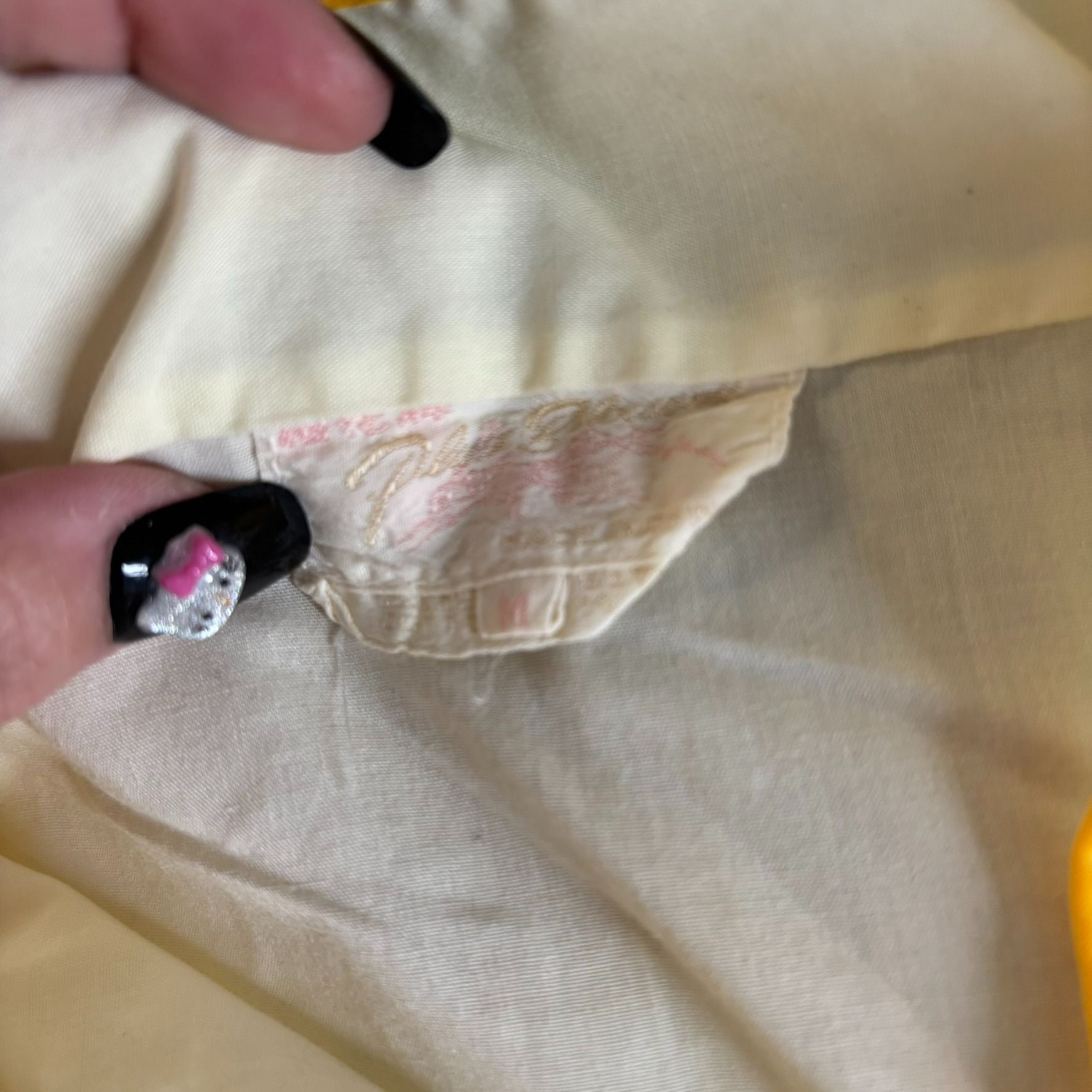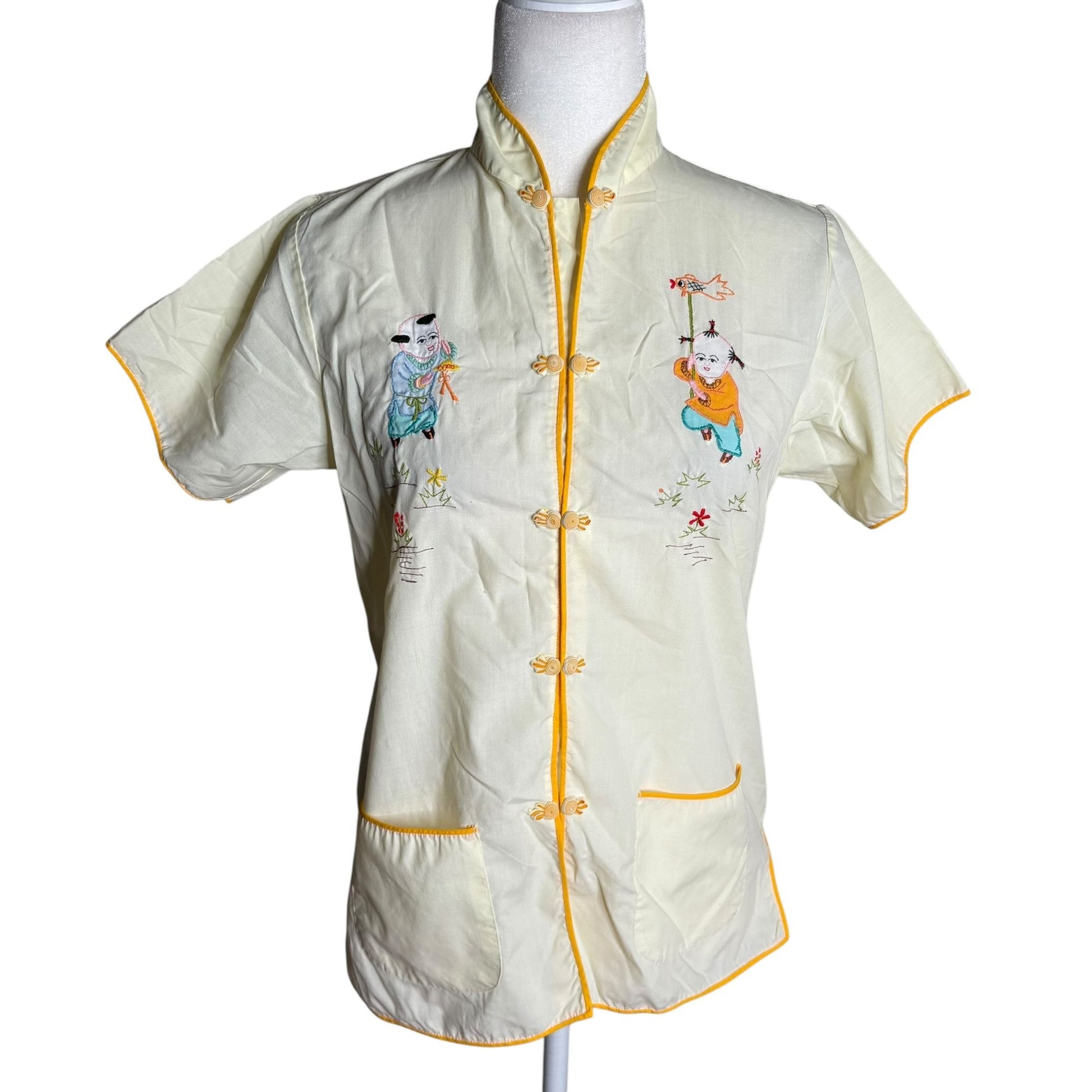 Vintage 70s Embroidered Chinese Short Sleeve Top Small Yellow Snaps Pockets