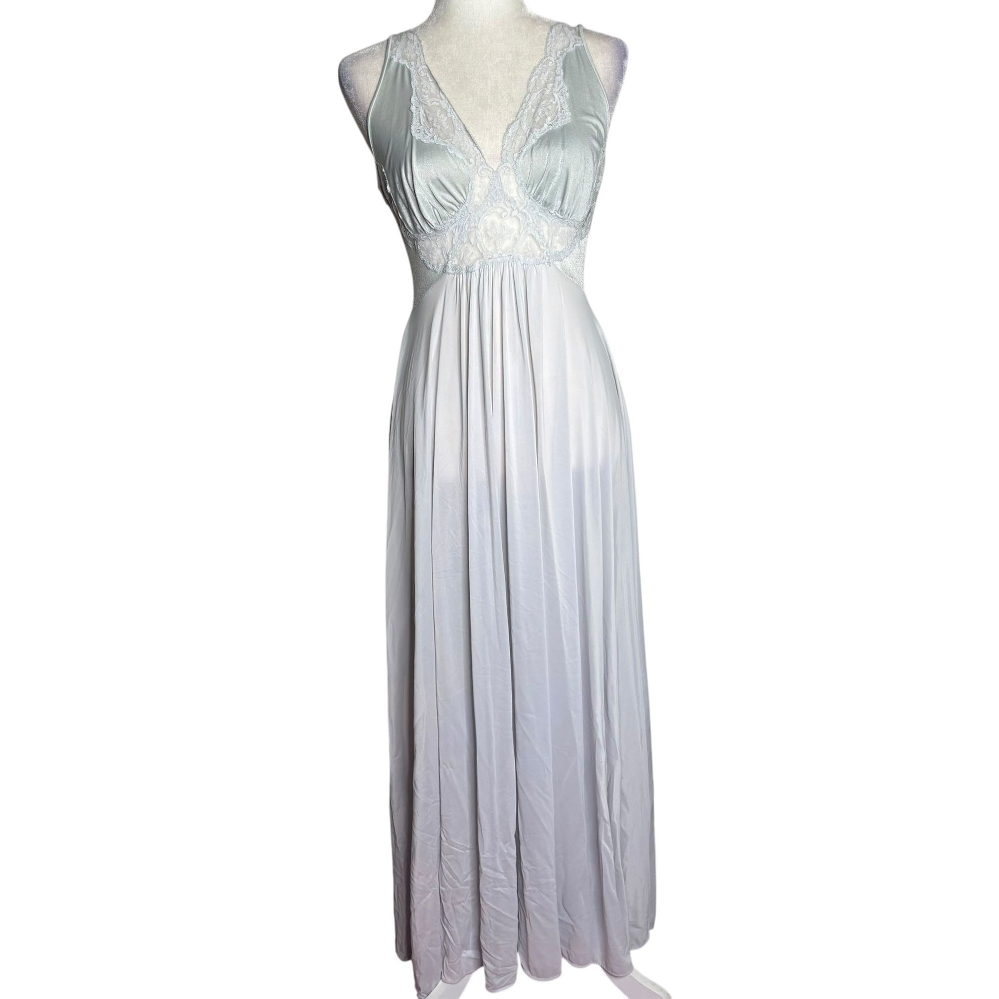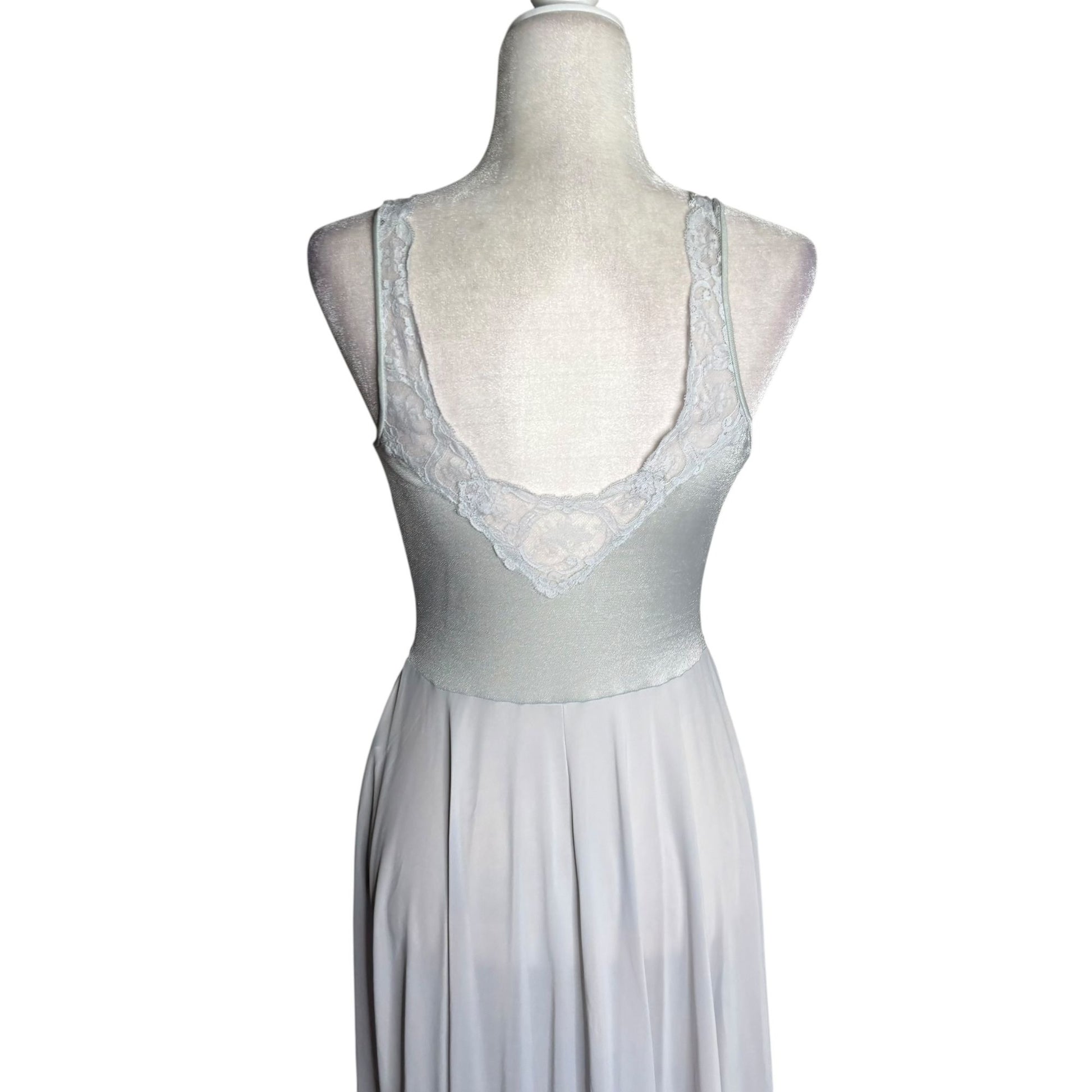 Vintage 70s Olga Nylon Maxi Nightgown Size Large Grey Lace Bodice Style 9296