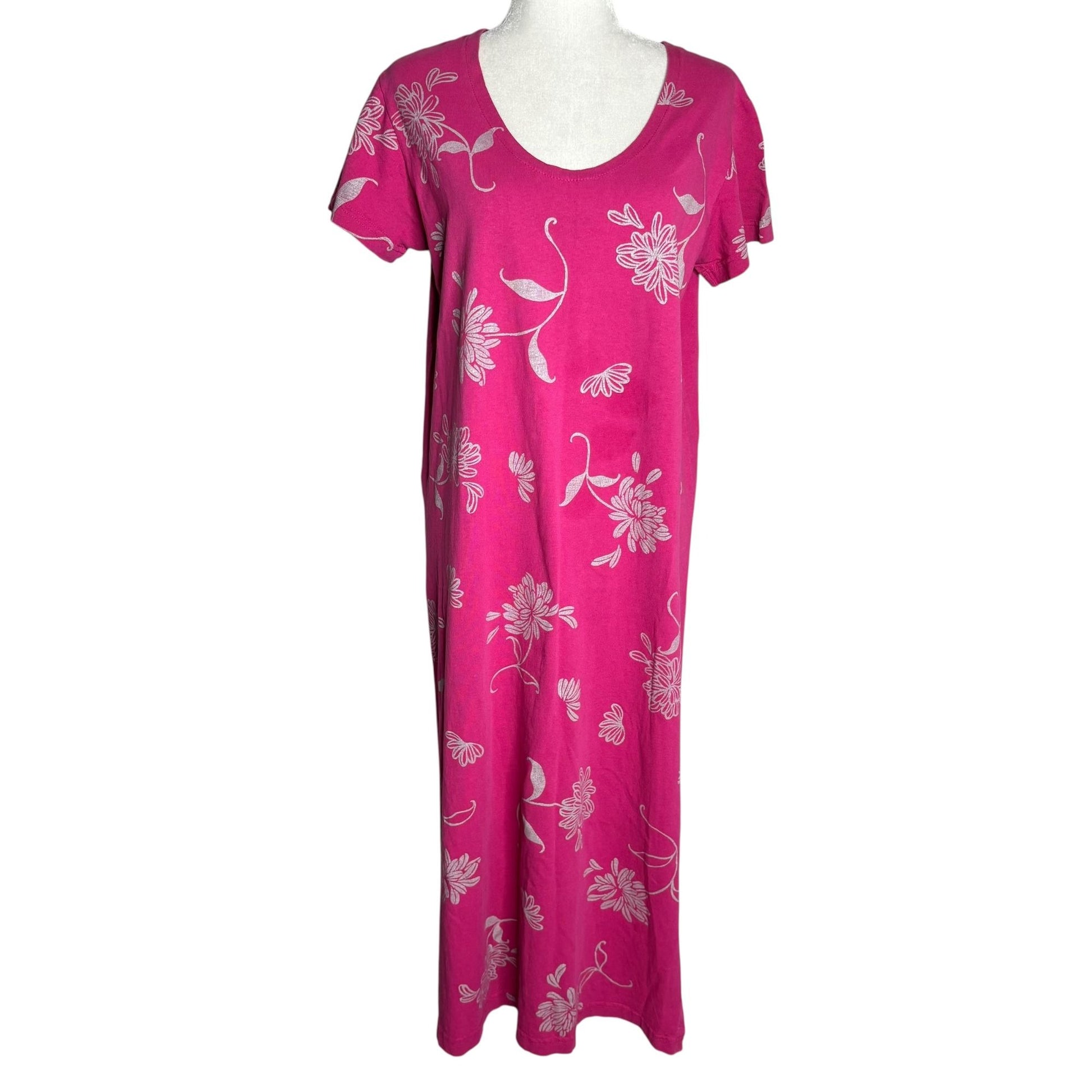 Vintage 90s Floral Cotton Maxi Dress Medium Pink Short Sleeve Scoop Neck